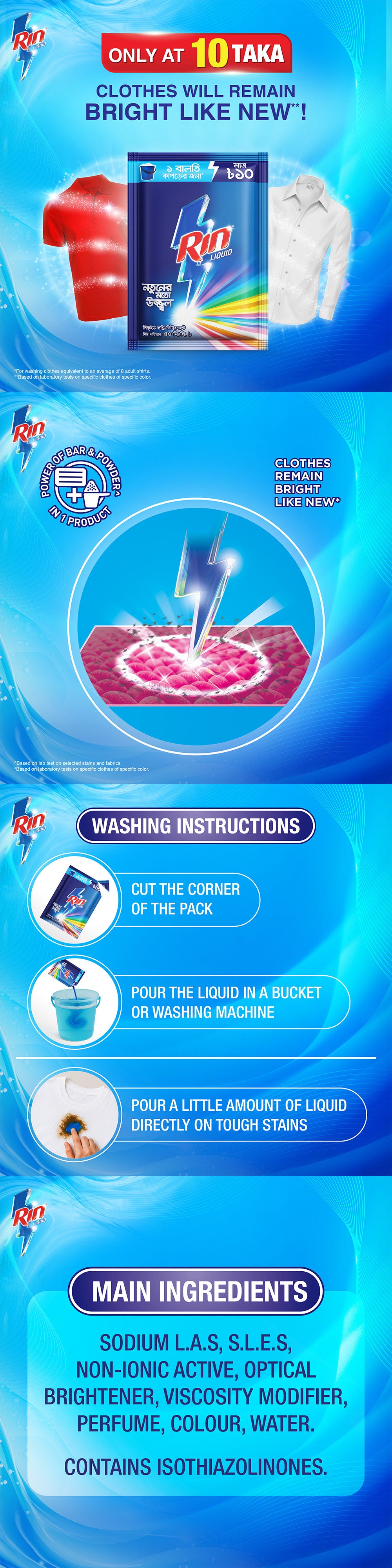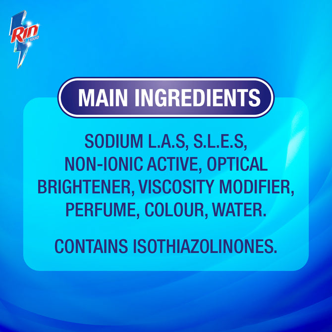 Rin Liquid is a liquid detergent which dissolves with water instantly and gives dazzling bright clothes. Its liquid formula dissolves easily with water, removes dirt from deep within the fibers and removes dullness to keep clothes bright as new. It combines the power of detergent and soap to have double impact making the laundry process easier!