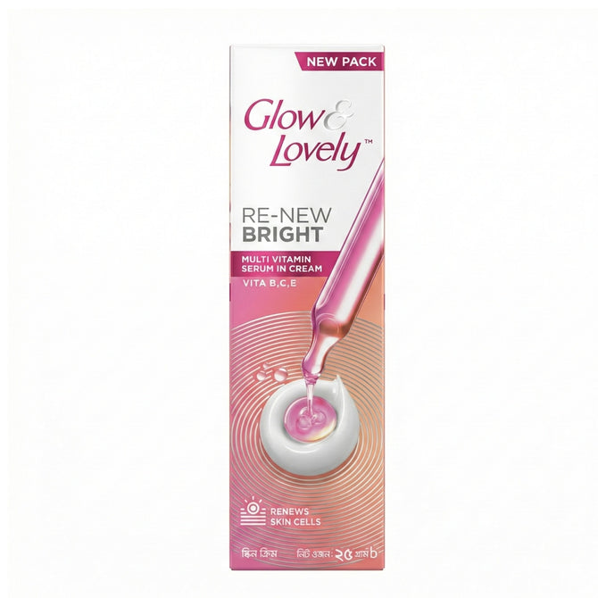 Glow & Lovely Re-New Bright Multivitamin Serum In Cream (formerly known as Fair & Lovely) works like a skin expert to give you a radiant glow which is skin clarity, brightness, and Radiance. Enriched with Vitamin B3, C and E, this cream gets quickly absorbed and penetrates deep* into the skin, to brighten skin cells, reduce spots and illuminate skin from inside out. Vitamin B3 also known as Niacinamide is known to improve skin barrier, act as an anti-inflammatory, protecting the skin’s natural health and giving a glow. Vitamin C is known to protect the skin from external damage and is known to improve skin immunity and reduce spots. Vitamin E known to moisturize your skin from deep within keeping it hydrated. Allantoin helps remove dull skin cells from top layers of skin revealing soft smooth glowing skin. Also has antioxidants that helps reduce dark circles. This formulation is clinically proven to give an even-toned; glowing skin which is non oily. It has UVA & UVB sunscreens known to protect the skin by blocking UV rays. The product has no bleaching agents and is dermatologically tested and proven. Just dot over face and massage evenly over face and neck. Use twice daily for best results after cleansing skin. *Within Epidermis