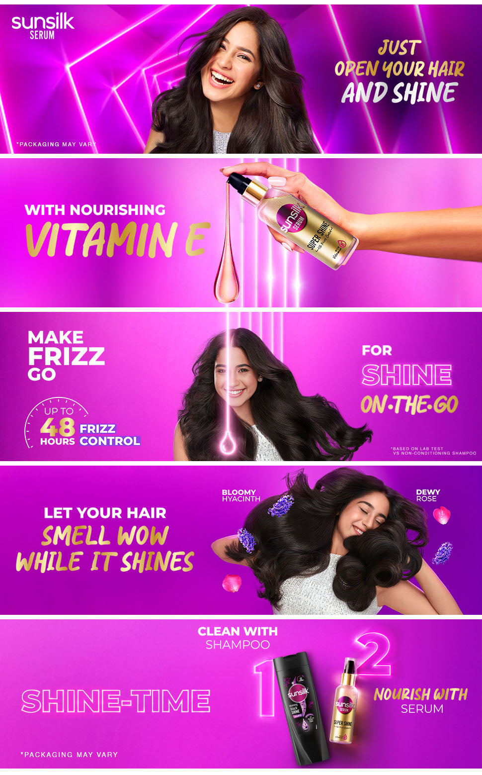 It’s your time to shine, so let your hair open! Get smooth, shiny hair with 48-hour frizz control^ using new Sunsilk Super Shine Hair Serum. A non-sticky hair serum with nourishing Vitamin E for Instant Shine. A few drops and a few seconds is all it takes to transform dry frizzy hair to gorgeous, shiny open hair with delightful fragrances of Bloomy Hyacinth and Dewy Rose. Our gorgeous pack is designed for on the go women, and can be carried anytime, anywhere! And when you get a chance to shine, just follow the 3 simple steps and shine anytime, anywhere, with radiant open hair!