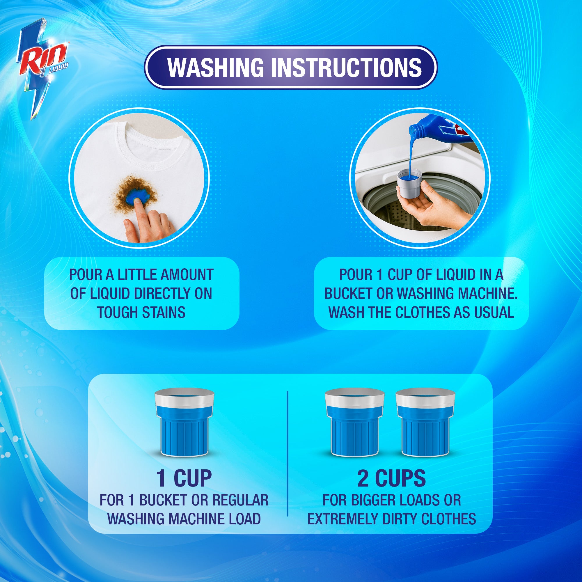 Rin Liquid is a liquid detergent which dissolves with water instantly and gives dazzling bright clothes. Its liquid formula dissolves easily with water, removes dirt from deep within the fibers and removes dullness to keep clothes bright as new. It combines the power of detergent and soap to have double impact making the laundry process easier!